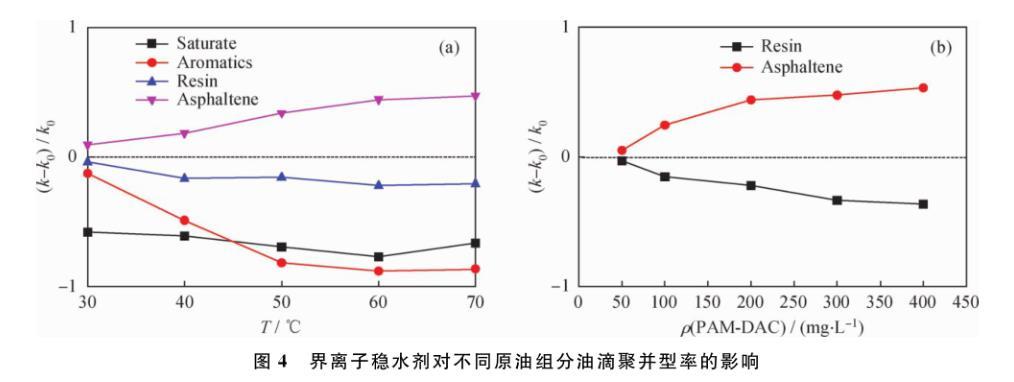 图4阳离子清水剂对不同原油组分油滴聚并速率的影响