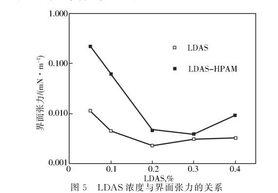 由图5可知,无论溶液有无聚合物存在,随着复配表面活性剂LDAS浓度的增加界面张力呈现先下降而后略有增加的现象。无聚合物时,活性剂LDAS浓度在0.1%~0.4%时界面张力均处于超低界面张力范围;加入0.12%HPAM后,油水界面张力略有上升,但0.2%和0.3%LDAS溶液与魏岗原油间的界面张力仍然很低,分别为0.003 8 mN/m和0.004 5 mN/m,表明复配表面活性剂体系具有很高的界面活性。
