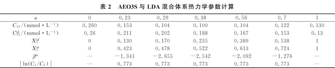 由图2可知,实际混合物的CMC比理想混合物的CMC值低,说明AEO3S与LDA的相互作用导致二元混合物的非理想行为。当混合比m(AEOS)∶m(LDA)为1∶2 ~ 4∶1时,AEOS在溶液中摩尔分数从0.23变化到0.7,相互作用参数βm在-1.2~-2.7之间变化。一般来说,βm反映了混合体系中2个表面活性剂组分在胶束中分子相互作用程度,负的程度越大,相互作用程度越强。β值的正负表明相互作用的类型,βm>0时,表示二组分之间有相互疏远、排斥的作用。βm<0时,表示混合体系内二组分之间有相互吸引作用,β绝对值的大小则反映出相互作用的程度,|βm|<3说明分子间相互作用较弱。说明分子间存在强烈的相互作用;3<|βm|<10说明分子间存在中等相互作用。由此可见,醇醚磺酸盐阴离子表面活性剂AEO3S与非离子表面活性剂LDA在盐水介质中的相互作用程度较弱。另外,二元体系产生协同作用的必须满足两个条件[17]:(1)βm<0;(2)|βm|>|ln(C1/C2)|。由表2中实验数据知AEO3S与LDA混合溶液的热力学参数均满足两个条件,说明二者具有降低CMC的协同作用。