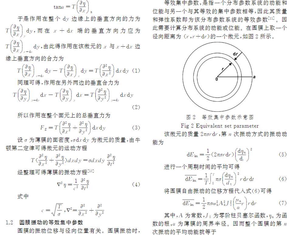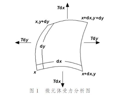 分析薄膜振动需进行受力分析。薄膜所受内力仅为张力。设单位长度薄膜张力为T(N/m),单位面积质量为ρ。取薄膜平衡位置在xy平面内的微元体分析(图1),当其受到垂直xy面的外力扰动后,会在张力T作用下产生横向振动,恢复力主要为张力。