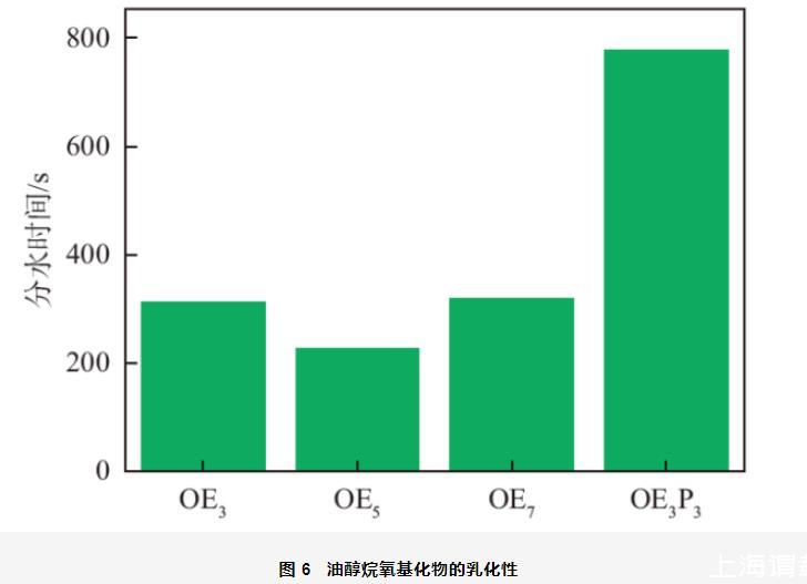 乳液是是热力学不稳定体系,乳液稳定性可以通过测定发生乳化作用后分出一定体积水所需时间来表示,分水时间越长,乳化性能越好。油醇烷氧基化物的乳化性如图6所示。OE3、OE5和OE7乳化液体石蜡的分水时间分别为313,228和319 s。当OEn中EO加合数由3增加到5时,其分水时间明显降低,乳化性降低。这是因为EO基团为亲水基团,当EO基团增加时,表面活性剂分子的亲水性增加,与疏水性的液体石蜡相互作用减弱,乳化性降低。当EO加合数由5继续增加到7时,其分水时间又显著增大,乳化性增强。这是因为当EO基团的加合数较大时,EO基团具有一定的疏水性,表面活性剂分子与液体石蜡相互作用增强,乳化能力提高。从图中还可以看出,当在OE3中引入PO基团后,OE3P3乳化液体石蜡的分水时间为778 s,乳化性显著增强,这是因为PO基团是疏水性基团,且具有一定的支化结构,当分子中引入PO基团后,使其更容易“插入”油相,增强表面活性剂分子与油相液体石蜡之间的相互作用,乳化性显著增强。