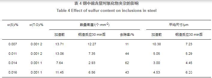 分析钢渣反应前后夹杂物的成分可知,重轨钢中氧化物夹杂分为SiO2-MnO系和CaO-Al2O3-SiO2系两类夹杂,图8所示为两类典型夹杂二维形貌。各类氧化物夹杂在钢渣反应前后数量密度变化见表6。可以看出,钢中主要夹杂为钙铝硅酸盐,因此钢渣反应30 min后,钙铝酸盐的去除率同总氧化物夹杂的去除率相近,随着氧、硫质量分数的增高,钙铝酸盐的去除率呈升高的趋势。由于钢中硅锰夹杂数量较少,且扫描面积有限,仅从以上表格统计的数量密度不具代表性,因此其去除率未呈现明显规律。