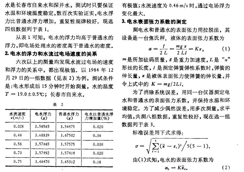 用自制电水器形成电水,用精度为0.1mg的电光天平测定电水和普通水的浮力。实验用水是长春市自来水和深井水,测试时只要保证水温和环境温度稳定,数百次实验证实,电水浮力比普通水浮力增加,重复性规律较好。现选四组数据列于表1。