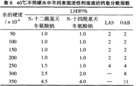 表6 40℃不同硬水中不同表面活性剂溶液的钙皂分散指数