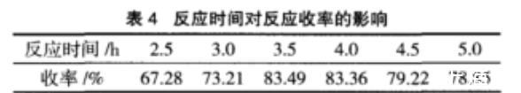 反应时间过短,则反应不完全,过长也无益于反应,因此适当的反应时间对反应收率也很重要。根据同类反应的情况,将反应时间选在2.5~5h。在反应体系pH=10~11、n(天冬氨酸)∶n(十四酰氯)=1.1∶1.0、温度5℃条件下,考察不同反应时间对反应的影响,其结果如表4所示。由表4可知,反应时间3.5h反应收率达到最佳。