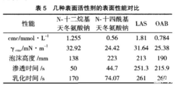 对N-十四酰基天冬氨酸钠盐的几项表面性能进行了测定,并与其他表面活性剂进行了对比,结果见表5。