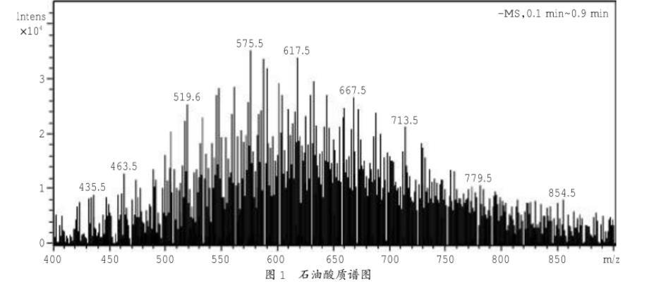 辽河原油石油酸的质谱图(见图1),从图1可以看出,石油酸相对分子质量主要分布在400~900,且质荷比大多数是奇数,与石油酸根的相对分子质量M=14n+45-2x相对应。依据质荷比计算石油酸的基本结构信息,如:409对应C27脂肪酸,407对应C27单环烷酸,401对应C27四环烷酸;605对应C41脂肪酸,603对应C41单环烷酸,601对应C41双环烷酸;599对应C41三环烷酸,597对应C41四环烷酸,595对应C41五环烷酸,593对应C41六环烷酸,591对应C40脂肪酸;899对应C62脂肪酸;可以确定辽河石油酸的碳数主要分布在C27~C62。对不同不饱和度的石油酸质谱峰离子强度进行归一化,获得不同类型石油酸的相对含量(见表3),可以看出环烷酸含量为86.58%,脂肪酸含量为13.42%。