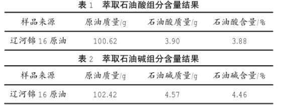 由表1、表2可以看出,辽河原油中萃出石油酸组分的含量为3.88%,萃出石油碱组分的含量为4.46%,石油碱略高于石油酸。