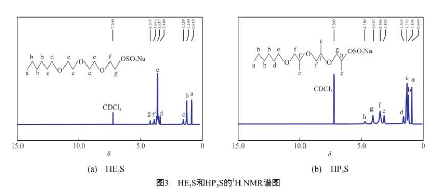 图3为HE3S和HP3S的1H NMR谱图。由于在合成过程中HE3和HP3为混合物,氢原子的化学位移(δ)会发生堆积,只能通过积分面积与δ确定特征基团的氢原子个数,而不能确定其裂峰[11]。由图3(a)可知,δ=0.845(3H,—CH3),1.250(6H,—CH2—),1.529(2H,—CH2—),3.410(2H,—CH2O—),3.637(8H,—OCH2CH2O—),3.964(2H,—OCH2—),4.205(2H,—CH2OSO3Na),7.260(CDCl3)。由图3(b)可知,δ=0.869(3H,—CH3),1.156(6H,—CH2—),1.275(9H,—CH3),1.565(2H,—CH2—),3.198(2H,—CH2O—),3.466(6H,—OCH2CH—O—),4.0 1 3(2 H,—O C H2—),4.7 1 0(1H,—CH—OSO3Na),7.260(CDCl3)。