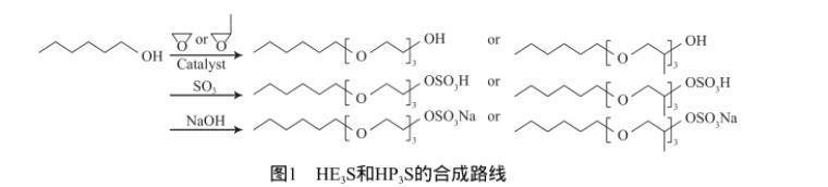 根据文献[11]报道的方法,在高压反应釜中加入正己醇和烷氧基化催化剂,升温后通入环氧乙烷或环氧丙烷,分别合成正己醇聚氧乙烯醚(HE3)与正己醇聚氧丙烯醚(HP3)。随后用经发烟硫酸制备的三氧化硫,与HE3或HP3进行硫酸化反应后再用氢氧化钠中和,最后经除盐和萃取提纯得到浅黄色膏状HE3S和HP3S,合成路线如图1所示。