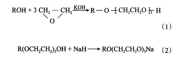 EO数为3的C14脂肪醇聚氧乙烯醚(3)磺酸盐(C14EO3S)、C16脂肪醇聚氧乙烯醚(3)磺酸盐(C16EO3S)、C18脂肪醇聚氧乙烯醚(3)磺酸盐(C18EO3S)按文献[1]报道的方法合成,产物经两相滴定法测定磺酸盐含量,纯度均达到95%以上。合成反应见式(1)~(3)。