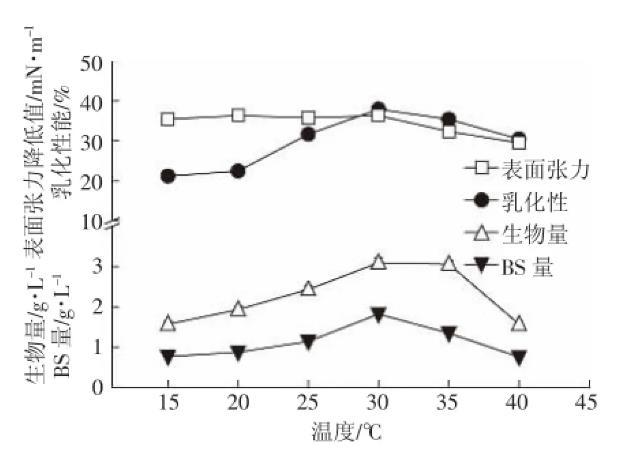 温度是影响菌株发酵产物产量的重要环境因素之一。不同细菌的最适生长温度不同。一般细菌在4℃停止生长,在30℃左右生长良好。已报道的铜绿假单胞菌(Pseudomonas aeruginosa)最适温度一般在27~37℃。由图4可以看到,表面张力值、生物量和生物表面活性剂产量都随着温度的升高呈现先升高后降低的趋势,在30℃时达到最大。乳化性在15℃到30℃时保持相对稳定,在30℃到40℃时乳化性降低。实际上大多数铜绿假单胞菌的最佳培养温度都在27~37℃,与实验结果相符。