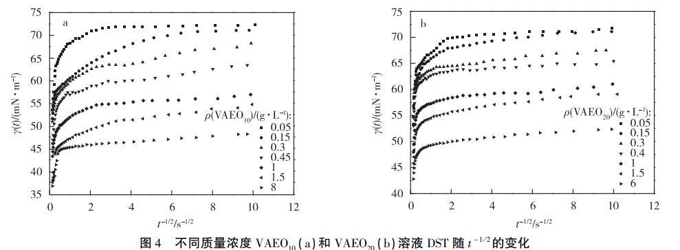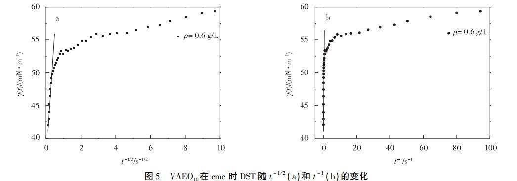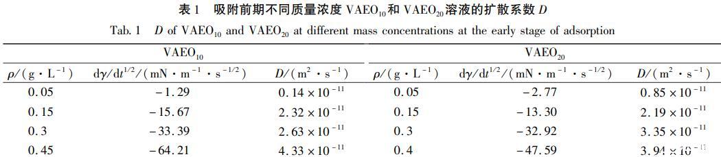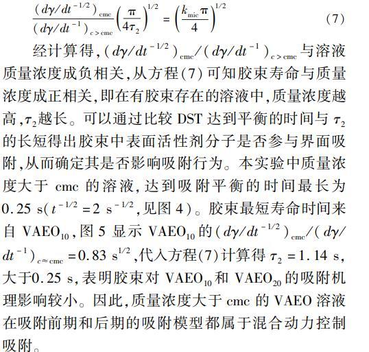 经计算得,(dγ/dt-1/2)cmc/(dγ/dt-1)c>cmc与溶液质量浓度成负相关,从方程(7)可知胶束寿命与质量浓度成正相关,即在有胶束存在的溶液中,质量浓度越高,τ2越长。可以通过比较DST达到平衡的时间与τ2的长短得出胶束中表面活性剂分子是否参与界面吸附,从而确定其是否影响吸附行为。本实验中质量浓度大于cmc的溶液,达到吸附平衡的时间最长为0.25s(t-1/2=2s-1/2,见图4)。胶束最短寿命时间来自VAEO10,图5显示VAEO10的(dγ/dt-1/2)cmc/(dγ/dt-1)c≈cmc=0.83s1/2,代入方程(7)计算得τ2=1.14s,大于0.25s,表明胶束对VAEO10和VAEO20的吸附机理影响较小。因此,质量浓度大于cmc的VAEO溶液在吸附前期和后期的吸附模型都属于混合动力控制吸附。
