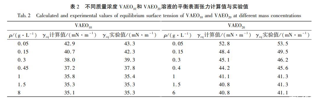 从以上对VAEO10和VAEO20在气/液界面的吸附行为的研究可知,当质量浓度小于cmc时,二者在吸附前期均表现为扩散控制吸附,扩散系数D的数量级为10-11m2/s,在吸附后期均为混合动力控制吸附,表观扩散系数Da的数量级为10-12m2/s.胶束存在时,τ2较长,大于到达γeq所需时间teq,胶束形成不影响表面张力随时间的变化趋势。据文献报道,壬基酚聚氧乙烯醚(NPEO9)浓度小于cmc时的扩散系数为3.9×10-10m2/s(滴体积法),平衡表面张力为30.6mN/m,可推测NPEO10的扩散系数在3.9×10-10m2/s附近,大于本研究中VAEO10的扩散系数。VAEO的疏水部分分子结构比NPEO的大,前者较后者多一个缩醛环和一个甲氧基,这两个基团一方面造成VAEO的空间体积较大,另一方面,缩醛环中的——O-与水分子可能形成氢键,均增加了VAEO扩散时的阻力,因而降低了扩散速率。