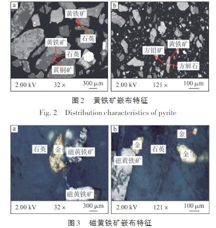 由图3可知:磁黄铁矿在矿石中主要以嵌布形式存在,主要嵌布于脉石矿物粒间,少量嵌布在脉石矿物裂隙中。嵌布于脉石矿物粒间的磁黄铁矿粒度以大于0.037 mm为主,而嵌布在脉石矿物裂隙中的磁黄铁矿多呈细脉状构造产出。常见金矿物与磁黄铁矿连晶嵌布于脉石矿物粒间,这表明磁黄铁矿与金矿物之间存在密切的关系,磁黄铁矿同样是主要载金矿物。