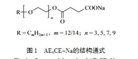 表面活性剂是一类应用广泛的有机化合物,极少的用量就能显著提高溶液的性能,因此,表面活性剂的研究具有重要的现实和理论意义。其中,阴离子和非离子型表面活性剂的用量最多且应用最为广泛,它们具有优异的去污性、水溶性、耐热性、耐盐性及制备成本低和环境友好等优点。然而,传统的表面活性剂分子通常只包含一个亲水头基和一个疏水尾链,很难同时具有阴离子和非离子表面活性剂的特性。值得一提的是,脂肪醇醚琥珀酸酯盐(AEnCE-Na,n=3,5,7,9)是一种新型的表面活性剂,结构通式如图1所示。结构决定性质,因此,可以推断AEnCE-Na具有许多优异的性能:1)一个分子中同时存在两个亲水基团(EO链和阴离子头基)和一个疏水基团(烷基碳链),使其具有优异的表面活性、乳化性和发泡性;2)分子中的酯基在水解后可形成具有优异生物降解性的非离子表面活性剂和盐,因此,该类表面活性剂安全且环保,符合当代“绿色化”的发展理念;3)直链表面活性剂比支链表面活性剂具有更好的自降解能力。然而,目前对于脂肪醇醚琥珀酸酯盐表面活性剂的研究甚少。