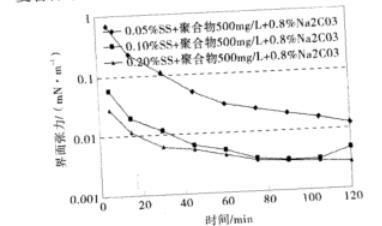 图1石油磺酸盐+聚合物500 mg/L+1.2%Na2CO3复配体系的动态界面张力(mN/m)