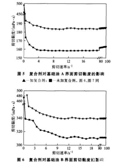 图5复合剂对基础油A界面剪切黏度的影响▲—加复合剂;■—未加复合剂。图6、图7同