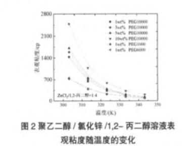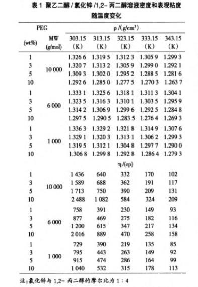 表1聚乙二醇/氯化锌/1,2-丙二醇溶液密度和表观粘度随温度变化