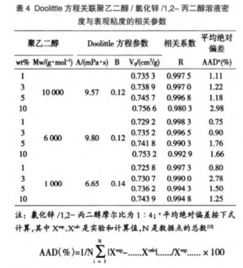 表4 Doolittle方程关联聚乙二醇/氯化锌/1,2-丙二醇溶液密度与表观粘度的相关参数