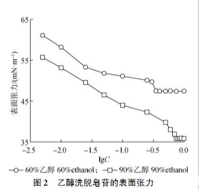 60%乙醇溶液洗脱得到皂苷的得率为39.03%,90%乙醇溶液洗脱得到皂苷的得率为5.01%。由图2可知,60%乙醇溶液洗脱得到的皂苷临界胶束浓度为0.35 g/L,最低表面张力为47.43 mN/m;而90%乙醇溶液洗脱得到的皂苷临界胶束浓度为0.75 g/L,最低表面张力为35.83 mN/m。可以看出,90%乙醇洗脱得到的皂苷临界胶束浓度更高,最低表面张力更低。说明苷元含量越高,其临界胶束浓度越大,最低表面张力越小。