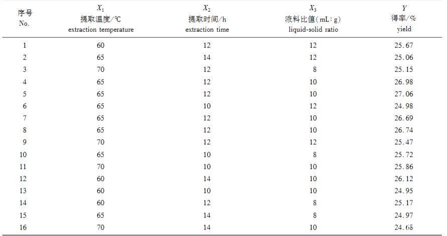 按照1.2.1节操作在时间8 h和温度45℃条件下,考察提取液料比对肥皂荚皂苷得率的影响。由图1(c)可知,液料比值为5~10时,随着液料比的增加,皂苷得率也随之增大,因为提取液的增加,增加了溶剂与原料的接触面积,有利于皂苷得率的增加;但当液料比值超过10时,由于溶剂量较大反而会影响到皂苷与溶剂之间的物质交换,皂苷得率呈现略微下降的趋势。