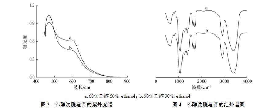 2种皂苷的紫外和红外光谱见图3和图4。由图3可知,2种皂苷样品的紫外最大吸收波长均在470 nm附近,且60%乙醇洗脱得到的皂苷吸光度低于90%乙醇洗脱得到的皂苷。