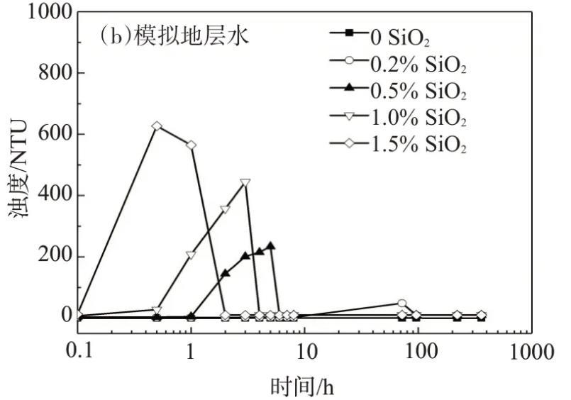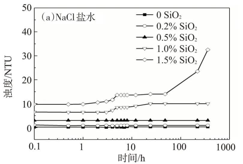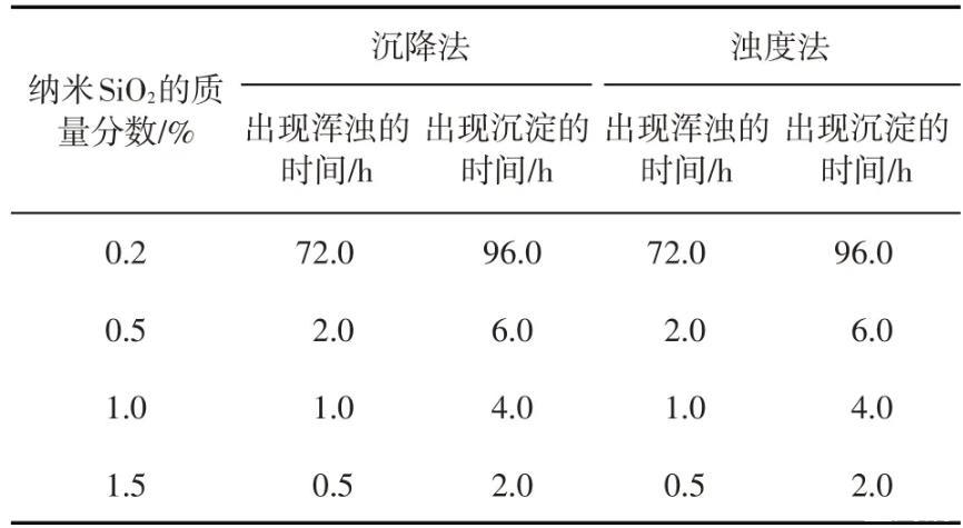 表1模拟地层水中纳米SiO2/SDS体系出现浑浊、沉淀的时间(SDS质量分数为0.3%)