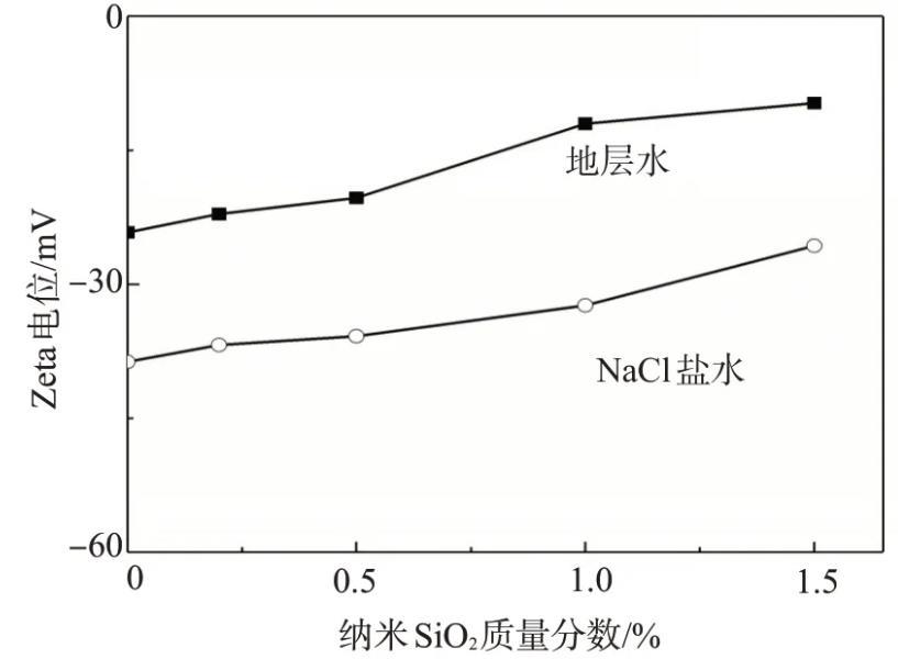 从图2还可以看出,随着纳米SiO2含量的增加,用两种盐水配制体系的|ζ|均不断降低,且纳米SiO2的含量越大,颗粒之间的距离越小,由于布朗运动相互碰撞聚结在一起的机率就越大,因此体系的稳定性越差。