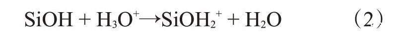 该反应使SiOH逐渐解离,减弱了SiO2表面的羟基和水之间的氢键作用,导致SiO2颗粒表面脱水,颗粒间水化作用力减弱,易发生聚并。在纳米SiO2/SDS体系中添加盐酸后,随着H+含量的增加,该反应向左移动,增强了SiO2表面的羟基和水之间的氢键作用,水化作用力增强,阻止了纳米SiO2颗粒之间发生桥接聚并,从而提高了体系的稳定性。