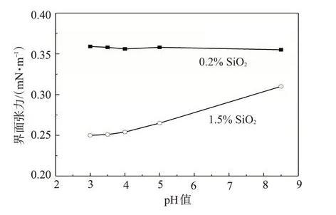 当SiO2质量分数为1.5%时,纳米SiO2/SDS体系静置不久纳米SiO2即聚集在一起,使得SiO2与SDS之间的排斥作用减小,随着pH值的降低,水化作用力及H+保护层的形成使得纳米SiO2聚集的几率大大降低,SiO2颗粒在体系中分散较均匀,因此SiO2与SDS之间的排斥作用增大,体系降低油水界面张力的能力增强。当SiO2质量分数为0.2%时,纳米SiO2/SDS体系具有较好的稳定性,pH值的下降对体系降低油水界面张力的能力基本无影响。