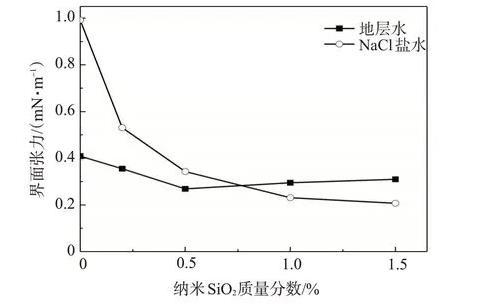 在NaCl盐水中,纳米SiO2/SDS体系的|ζ|基本大于30 mV,体系更易稳定;模拟地层水中二价阳离子的存在使得体系的|ζ|均小于30 mV,颗粒容易聚集沉淀。纳米SiO2含量越大,颗粒之间碰撞的机率增加,纳米SiO2/SDS体系的稳定性越差。随着纳米SiO2含量的增加,SDS降低油水界面张力的能力在NaCl盐水中逐渐增强,而在模拟地层水中先增后减,在SiO2质量分数为0.5%时界面张力达到最低。