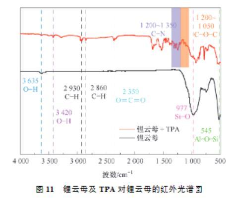 DDA及TPA的动电位结果如图8所示。在pH值为3~11时,未被药剂吸附的锂云母电位均为负值,DDA或TPA在锂云母表面吸附后,Zeta电位均发生正移。其中,DDA对Zeta电位的改变较小,电位虽然出现正移,但在不同pH值条件下,Zeta电位依然均为负值。TPA对Zeta电位的改变较大,仅在pH值为11时,Zeta电位为负值,其他pH条件下Zeta电位正移明显,均为正值。带有正电荷的胺类捕收剂吸附在带有负电荷的锂云母表面,使得锂云母表面电荷发生正偏移,说明胺类捕收剂DDA或TPA均以静电吸附方式吸附在锂云母矿物表面。此外,具有更长碳链的TPA吸附锂云母后,展现出比DDA吸附后更强的Zeta电位正电性,这主要是因为碳链长度更长的胺类捕收剂以疏水效应形式与溶液中存在的表面活性剂形成二维缔合,导致矿物表面吸附现象显著增加。在中性偏酸的条件下,DDA或TPA吸附锂云母后均呈现比碱性条件下更强的正电性,这说明胺类捕收剂在中性偏酸条件下在锂云母表面吸附更紧密,这与浮选结果一致。