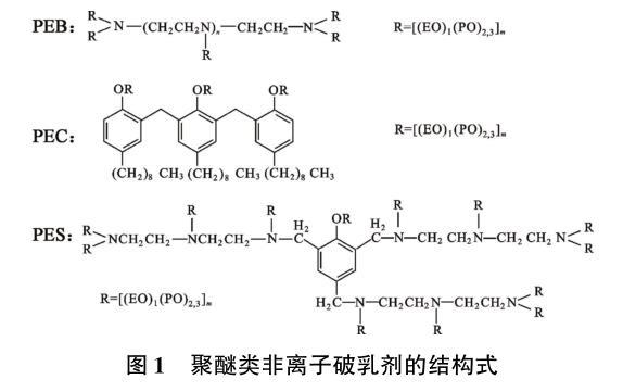实验用破乳剂HY01是季铵盐类阳离子破乳剂,相对分子质量约6 000,固含量约35%;其他破乳剂为聚醚类非离子表面活性剂,平均相对分子质量均在5 000左右,EO(乙氧基)∶PO(丙氧基)=1∶2.3。3种聚醚类非离子破乳剂的结构式见图1,其中PEB是支状聚醚类非离子破乳剂,属于多乙烯多胺聚氧乙烯聚氧丙烯醚型破乳剂,PEC是梳型聚醚类非离子破乳剂,属于酚醛树脂聚氧乙烯聚氧丙烯醚型破乳剂,PES是星型聚醚类非离子破乳剂,属于酚胺醛树脂聚氧乙烯聚氧丙烯醚型破乳剂。