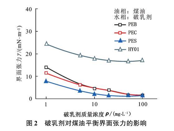 图2破乳剂对煤油平衡界面张力的影响
