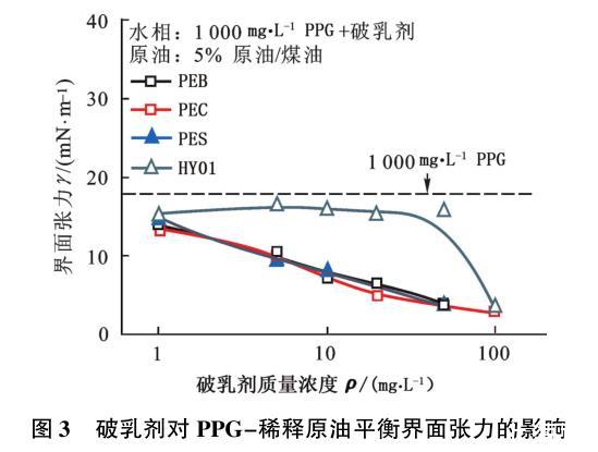 图3破乳剂对PPG-稀释原油平衡界面张力的影响