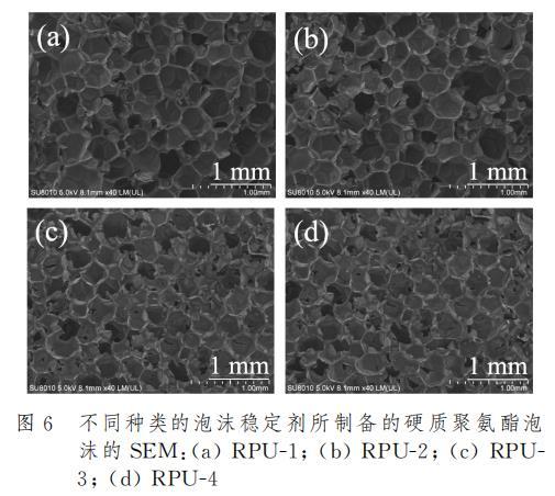 泡沫稳定剂的存在对于硬质聚氨酯泡沫性能影响在宏观上有着十分显著的体现。图5是添加不同种类的泡沫稳定剂后制样得到的硬质聚氨酯泡沫横截面的数码照片。结果表明,接枝APEG链段的PAVE-5和PGVF-6泡沫稳定剂所制备的聚氨酯泡沫RPU-3和RPU-4,其泡孔结构相较于市售产品所制备的聚氨酯泡沫展现出了更加细腻均匀的泡孔结构,而市售产品所形成的泡沫则表现出较为粗糙且孔径不均匀的泡孔结构。这表明亲水结构有利于泡沫稳定剂均匀分散在多元醇中并使得反应充分进行,泡孔尺寸细小致密,有利于改善硬质聚氨酯泡沫的压缩性能。