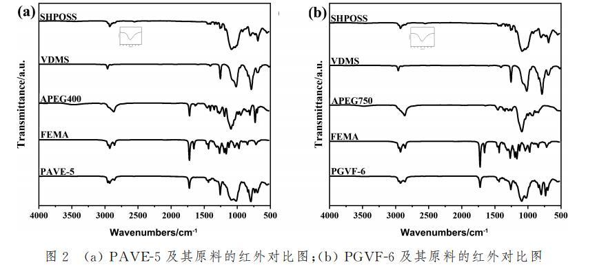 通过红外光谱对所制得功能材料的官能团化学状态进行表征分析,图2(a)和2(b)分别为PAVE-5和PGVF-6及其原料的红外吸收光谱图。PAVE-5和PGVF-6谱图中,能够清晰观察到处于2960cm-位置的CH3反对称伸缩吸收峰,处于2930和2860cm-1的CH2伸缩吸收峰,处于1720cm-位置的酯基C=O伸缩吸收峰,处于1256cm-1位置的C-O-C伸缩吸收峰,和处于1090和1010cm-位置的Si-O-Si吸收峰,而原本SH-POSS处的S-H吸收峰消失,VDMS、APEG400、APEG750和2-壬烯酸甲酯的单体C=C伸缩吸收峰也消失,表明PAVE-5和PGVF-6制备成功。