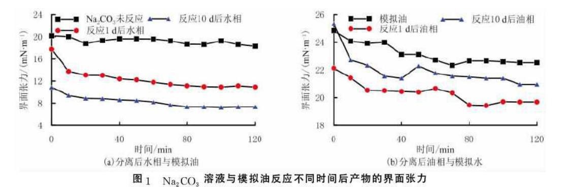 在Na2CO3溶液与模拟油反应1d和10d后,分离得到的水相及油相分别与模拟油及模拟水间的界面张力随测定时间关系见图1.由图1(a)可以看出,Na2CO3溶液和模拟油反应1d及10d后分离出的水相与模拟油的界面张力,比未反应Na2CO3溶液与模拟油的界面张力低,且随着反应时间增加,水相与模拟油的界面张力降低。这说明模拟油中酸性物质与Na2CO3溶液反应生成的部分界面活性物质具有较好的水溶性。水溶性的界面活性物质在油水界面处吸附,使分离出的水相与模拟油界面张力降低;随着反应时间的增加,所生成的界面活性物质增多,分离出的水相与模拟油的界面张力降低幅度增大。