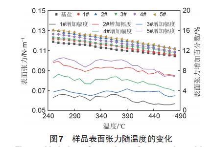样品的表面张力值随温度变化如图7所示。可以看到,在250~480℃内,基盐的表面张力在0.1044~0.1188N/m,表面张力随温度的升高呈下降趋势。1#纳米熔盐的表面张力在0.1059~0.1219N/m,对数据进行拟合后,拟合系数在0.995以上,拟合程度较好。2#纳米熔盐的表面张力在0.1117~0.1301N/m,拟合系数为0.996,随温度变化的趋势和基盐及一般熔盐表面张力的变化趋势保持一致,均随温度的升高呈下降趋势。3#和4#纳米熔盐的表面张力在0.1075~0.1232 N/m和0.1085~0.1265 N/m,拟合系数都在0.994以上,其中4#纳米熔盐的拟合系数与2#纳米熔盐的拟合系数相同,均为0.996,拟合程度最好。5#纳米熔盐的表面张力在0.1115~0.1305N/m,拟合系数为0.991。