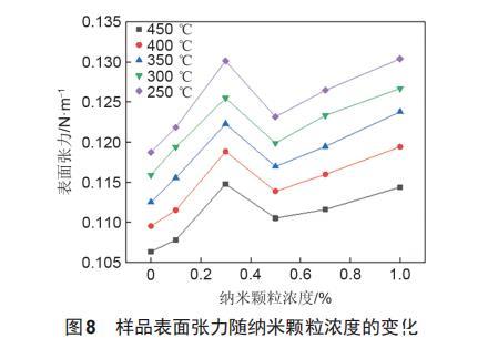 图8为不同温度工况点下样品表面张力随纳米颗粒浓度的变化情况。