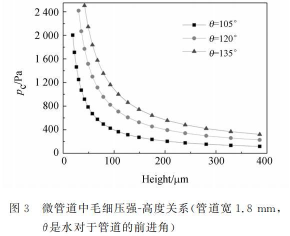 其中,l_i是液体与管道第i条边接触线的长度,theta_i是液体对于管道第i条边的前进角,对于矩形管道有i=1,2,3,4。毛细压强和管道高度的关系如图3所示。液体在疏水网表面的流动阻力计算比较复杂,现在有很多的研究文献,由于这不是本文的研究重点,文中采用了简化分析,即把栅网作为一个光滑的表面。计算中认为栅网与管道的表面特性相同。