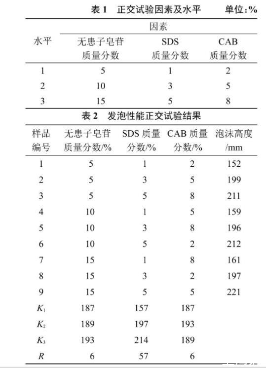 以发泡体系的复配组分(无患子皂苷、SDS、CAB 3种表面活性剂)为考察的3个因素,根据3种表面活性剂的发泡性能,每个因素选3个水平,选用L9(33)正交试验设计优化泡沫灭火剂的配方,正交表设计如表1所示。