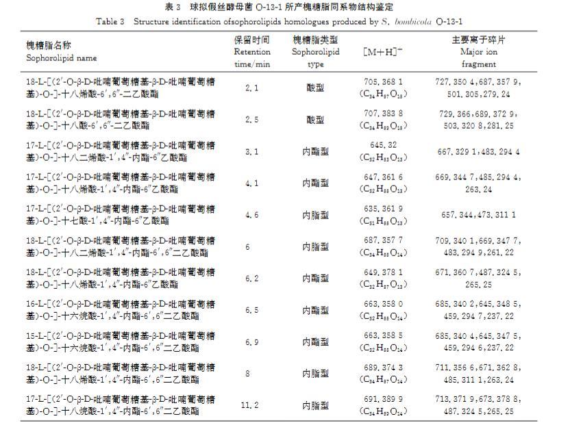 表3球拟假丝酵母菌O-13-1所产槐糖脂同系物结构鉴定