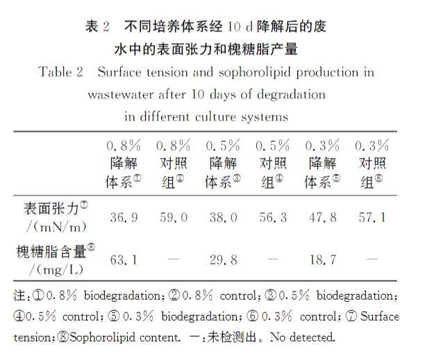表2不同培养体系经10d降解后的废水中的表面张力和槐糖脂产量