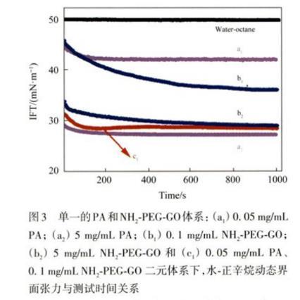 当低质量浓度的NH2-PEG-GO与PA共存时,相比于单组分NH2-PEG-GO(0.1 mg/mL)或PA(0.05 mg/mL)能更有效降低界面张力。例如,油相水相分别添加低质量浓度的PA(0.05 mg/mL)与NH2-PEG-GO(0.1 mg/mL),即可实现与单独添加高质量浓度PA(5 mg/mL)或NH2-PEG-GO(5 mg/mL)相同的效果。并且此时界面张力随时间变化曲线与单独添加PA类似,平衡时间在200 s左右。这表明前期的界面张力降低现象主要由PA吸附引起。