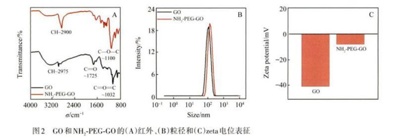 图2 GO和NH2-PEG-GO的(A)红外、(B)粒径和(C)zeta电位表征
