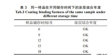 在温度为23℃、相对湿度为60%的环境下,测试样品在不同储存时间下的涂层结合牢度。在真空镀铝时,涂层是铝原子附着的载体,因此与铝原子的接触附着十分重要,而且要有利于铝原子附着和排列,这就要求涂层与铝原子有良好的结合力。使用3M810胶带平贴于纸面60 s后45°快拉,并在强光下观察表面涂层是否有脱落。测得数据见表3,所有样品涂层均未脱落。显而易见,纸样涂层的层间结合力及涂层与底纸的结合力在储存一年后依然符合相关要求,并未出现突然变差的情况,证明掉墨现象并非由涂层牢度不佳导致。