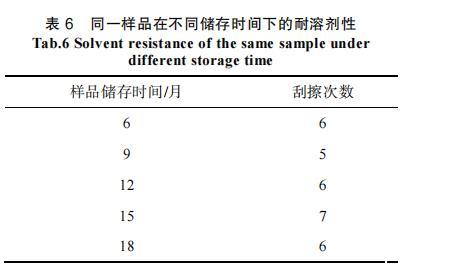 转移涂层的耐溶剂性是另一个重要指标。当印刷油墨与耐溶剂性差的涂层接触时,涂层的表面结构会被溶剂侵蚀,既会影响纸张表面光泽性,又会导致脱墨现象。为了研究硅含量的增加对涂层的耐溶剂功能性是否发生影响,在温度为23℃、相对温度为60%的环境下,使用棉棒蘸取乙酸乙酯,人工刮擦储存6—18个月的样品的表面涂层,观察涂层露底变白时的刮擦次数,刮擦次数越多证明转移涂层耐溶剂性越好,测得数据见表6。可以看出,不同储存时间下的样品刮擦次数均在5~7次,并没有出现明显的升高或降低现象,证明转移涂层的耐溶剂性并未随着时间变化而变化,硅含量的增加对涂层的耐溶剂性并未发生影响。