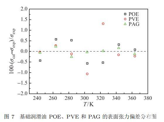 式中,T 是温度,K;σ 是表面张力,mN·m⁻¹;a、b 和 c 为关联方程的拟合参数。基础润滑油 POE、PVE 和 PAG 的参数关联值和绝对平均偏差列于表 4 中,其实验数据与关联方程的绝对平均偏差分别为 0.43%、0.45% 和 0.13%;三种基础润滑油的相对偏差分布如图 7 所示,其实验测量结果的相对偏差均在 ±1.5% 以内,表明实验结果与关联方程的吻合良好。